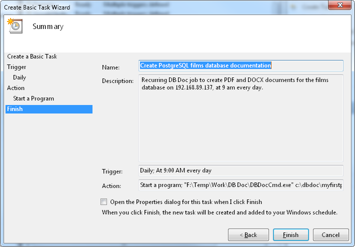 Next, you can set up a Windows scheduled task to automatically generate your documentation as frequent as you need. For