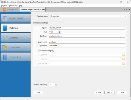 Click on the Next button. Enter the details of the PostgreSQL database you want to connect to and create documentation for.