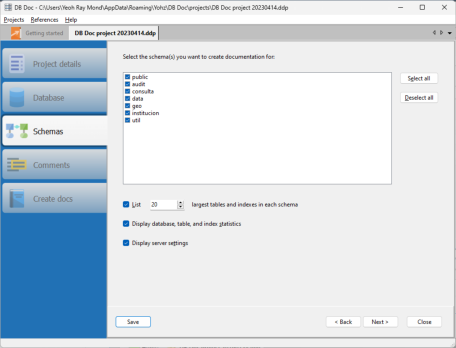 can choose which schemas to generate the documentation for, and if statistical data should be displayed.