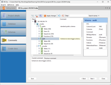 Click Next. On this page, you can then edit/update the comments for the various database objects in the selected schemas.
