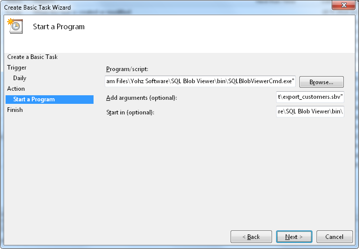 For the ‘Start in’ value, enter the SQL Blob Viewer folder