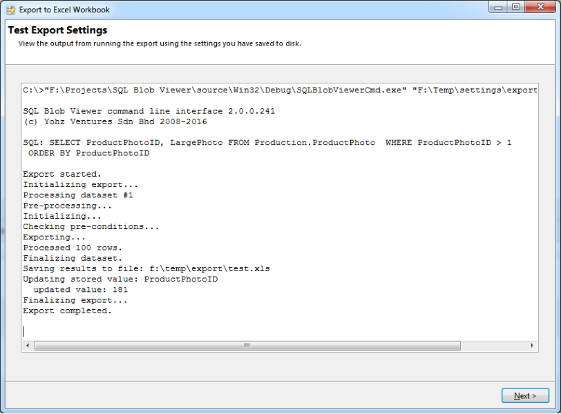 The SQL Blob Viewer Professional Edition license includes a command line interface (SQLBlobViewerCmd.exe) you can