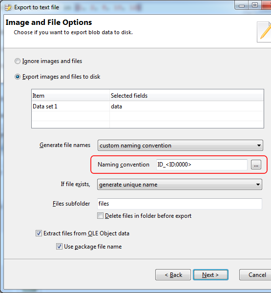 You can of course change the file naming convention to fit your needs. If instead we had selected the ID column in