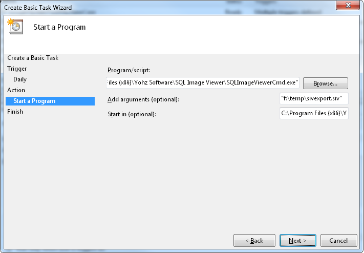 For the ‘Start in’ value, enter the SQL Image Viewer folder
