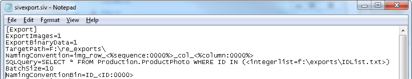 This tells SQL Image Viewer to open the file f:\exports\IDList.txt and use the integer values in that file as part of