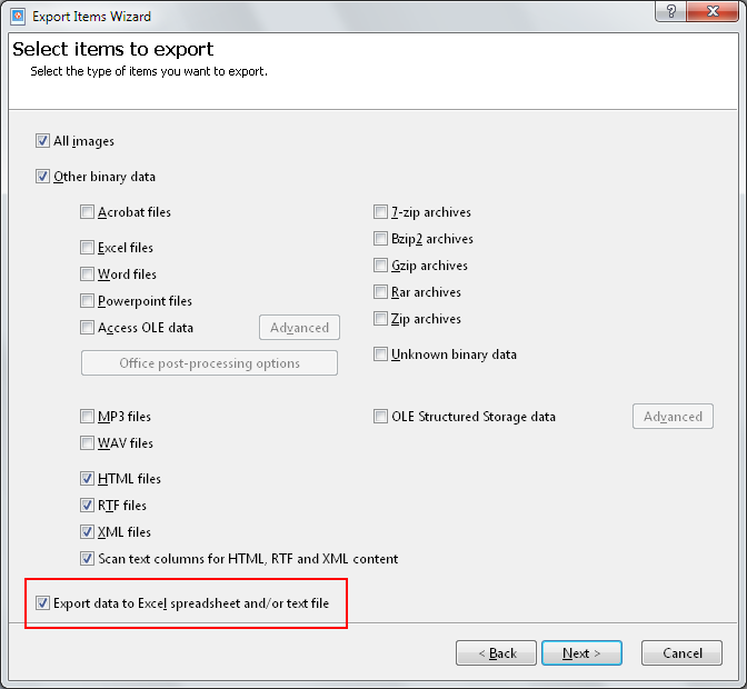 selecting the Export data to Excel spreadsheet and/or text file item in the Export Items Wizard.