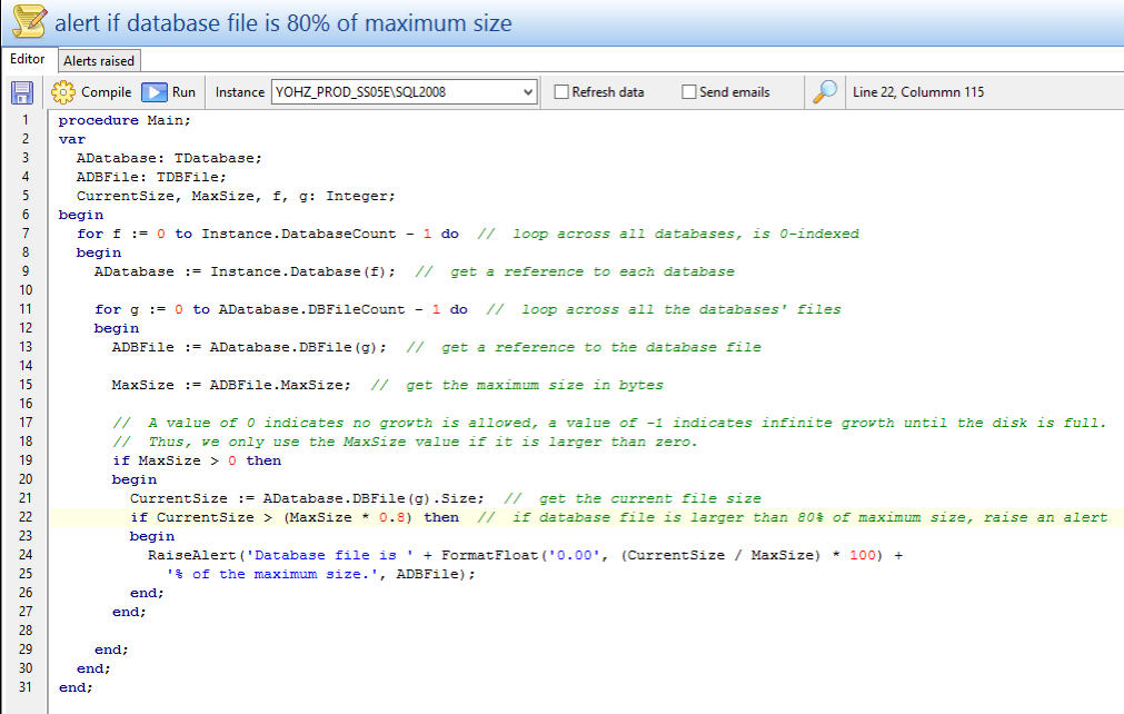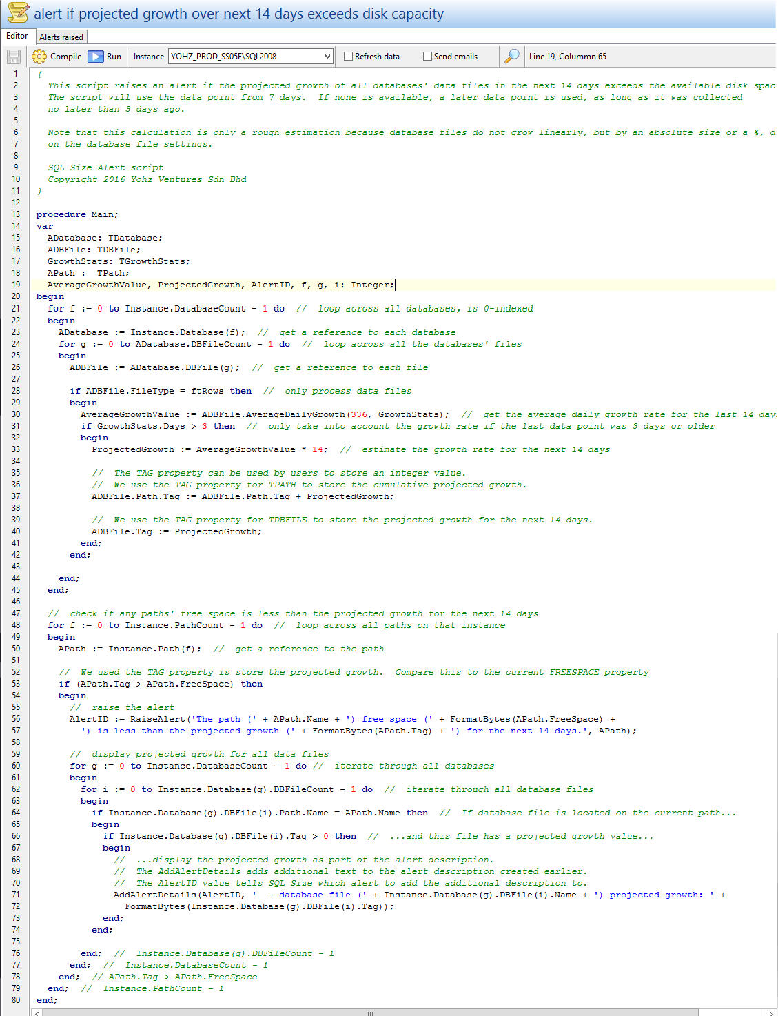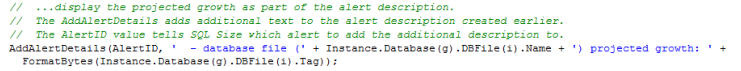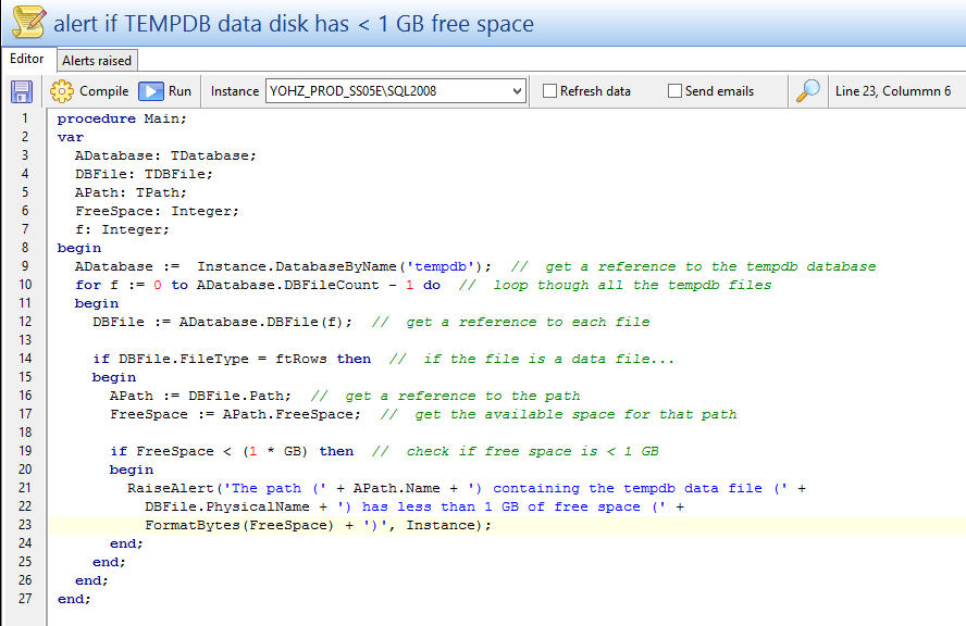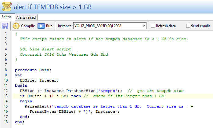 template. As its name implies, this script raises an alert when the tempdb database size exceeds 1 gigabyte.