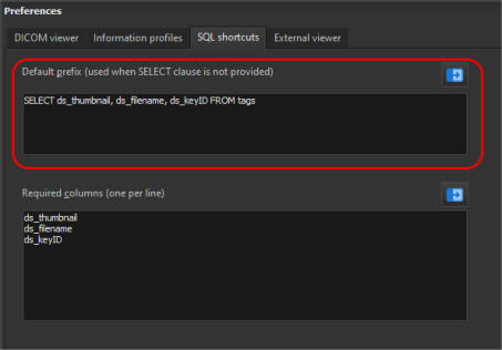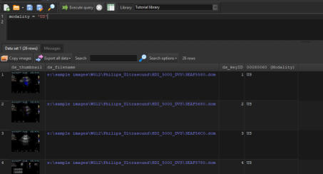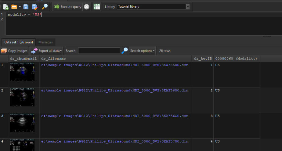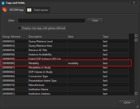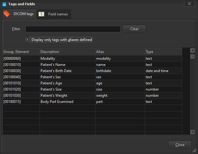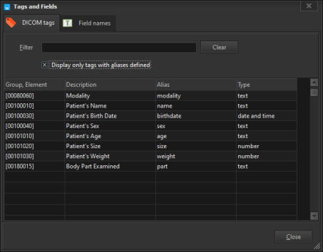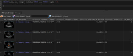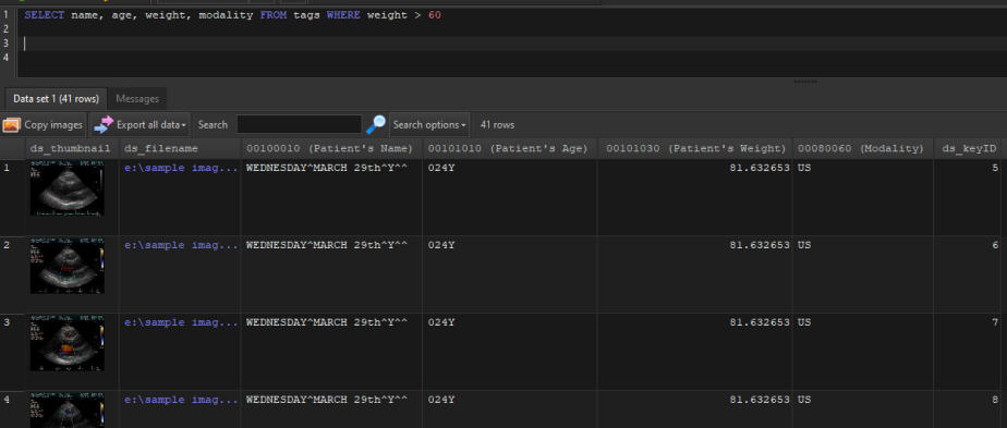 In addition to allowing you to use the full SQL syntax to run your queries, DICOM Search also offers a simpler way of running your search.Recall that in our previous step, to retrieve all images with the ultrasound modality, we enteredSELECT * FROM tags WHERE [00800060] = 'US'The disadvantage of this is that you need to remember which columns to select, the name of the table, and also the proper syntax (SELECT … followed by FROM tags followed by WHERE …).What if you could enter just this:modality = 'US'That’s all, DICOM Search will return the same 26 rows, this time with only the essential columns. Behind the scenes, DICOM Search is actually running this query:SELECT ds_thumbnail, ds_filename, ds_keyID , [00080060] FROM tags WHERE [00080060] = 'US'Now, how did DICOM Search expandmodality = ‘US’toSELECT ds_thumbnail, ds_filename, ds_keyID , [00080060] FROM tags WHERE [00080060] = 'US'Let’s break this down. First, the SELECT portion i.e.SELECT ds_thumbnail, ds_filename, ds_keyID , [00080060] The fields ds_thumbnail, ds_filename, ds_keyID have been set up as the default query prefix if your query does not start with SELECT. You can inspect this value by selecting the Application > Preferences item from the main menu.You can add additional columns to the default prefix. The [00080060] field is added automatically to the SELECT list because it was used in your search criteria.The FROM tags portion never changes, as it is the only table we can search in. Finally, the search criteria:WHERE [00080060] = 'US'is added because we have an alias defined for the modality tag. If you bring up the Tags and Fields window, there is an Alias column where you can define short names for each public DICOM element. In this case, we already have an alias for element 0008,0060, modality.Thus, anytime we use the word modality in our search query, DICOM Search will replace that value with [00080060]. There are a few predefined aliases already set up, and you can add more as required, or modify the existing aliases.Aliases must start with an alphabet, contain only alphanumeric characters, and cannot contain spaces in them.Aliases can be used in the SELECT or WHERE portion of our queries. Try running this query:SELECT name, age, weight, modality FROM tags WHERE weight > 60Next, we’ll talk more about setting up the shortcuts that help us write simplified search queries.