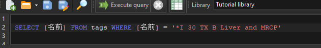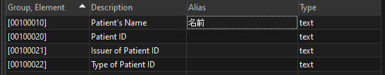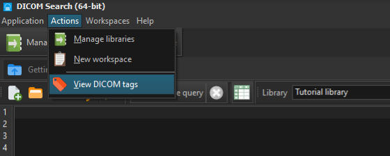 The other element that helps us write simplified queries is the tags aliases. DICOM Search indexes all the DICOM tag values in your images, and it would be inconvenient to have to always type in the group and element codes for the values we want to retrieve or search. To ease this task, DICOM Search lets you create aliases for any DICOM tag.DICOM Search ships with some pre-defined aliases. To view or modify the aliases, first bring up the Tags and fields window. You can do this by selecting the Actions > View DICOM tags item from the main menu:or by pressing F2 when your cursor is in the query window area.In the Tags and Fields window, enter the alias you want to use in the Alias column. For e.g. to create an alias for 0008,0020 (Study Date), we just enter the following:Press ENTER or RETURN to save the alias. Now any time you want to use the Study Date tag, just enter studydate instead of [00080020] e.g.Aliases must meet the following conditions:•they must not start with a numeric value•they must contain only alphanumeric values•they must not contain spacesYou can use non-English words as aliases. For e.g. you could define the Japanese word for name for tag element [00100010] this way:When using non-Latin character aliases, you would need to enclose the alias in square brackets e.g.Next, we’ll explore using more advanced search queries.