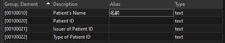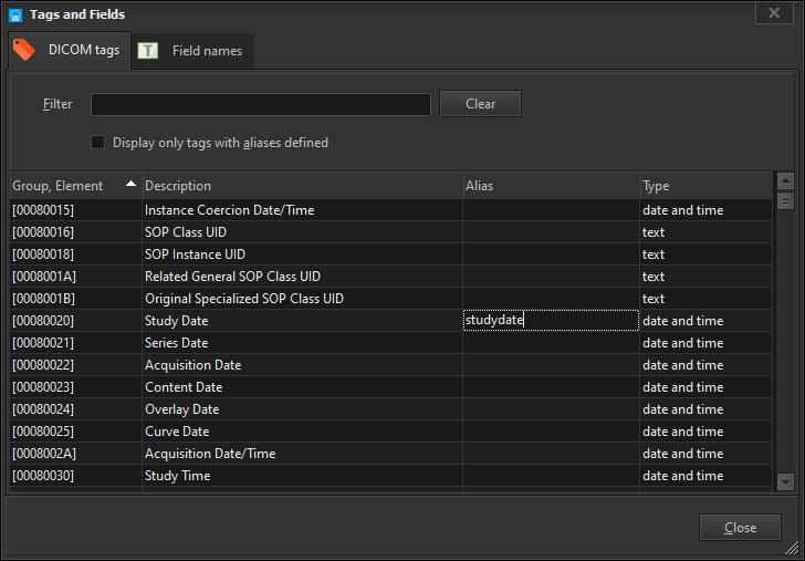 The other element that helps us write simplified queries is the tags aliases. DICOM Search indexes all the DICOM tag values in your images, and it would be inconvenient to have to always type in the group and element codes for the values we want to retrieve or search. To ease this task, DICOM Search lets you create aliases for any DICOM tag.DICOM Search ships with some pre-defined aliases. To view or modify the aliases, first bring up the Tags and fieldswindow. You can do this by selecting the Actions > View DICOM tags item from the main menu:or by pressing F2 when your cursor is in the query window area.In the Tags and Fields window, enter the alias you want to use in the Alias column. For e.g. to create an alias for 0008,0020 (Study Date), we just enter the following:Press ENTER or RETURN to save the alias. Now any time you want to use the Study Date tag, just enter studydate instead of [00080020] e.g.Aliases must meet the following conditions:•they must not start with a numeric value•they must contain only alphanumeric values•they must not contain spacesYou can use non-English words as aliases. For e.g. you could define the Japanese word for name for tag element [00100010] this way:When using non-Latin character aliases, you would need to enclose the alias in square brackets e.g.Next, we’ll explore using more advanced search queries.