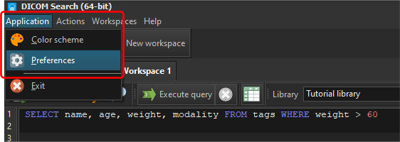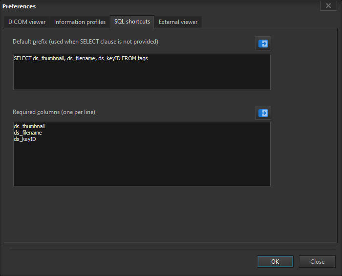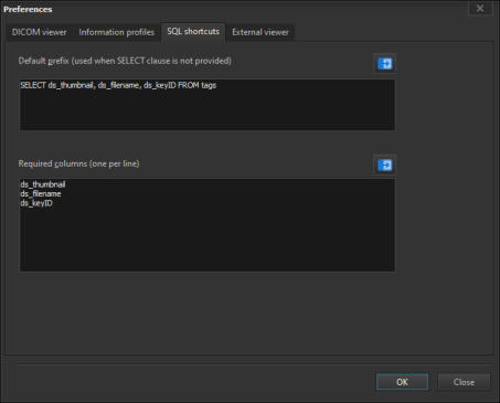 To define the default prefix when your search query does not contain a SELECT list, you need to first open the Preferences window by clicking on the Application > Preferences item from the main menu.In the Preferences window, select the SQL shortcuts tab.The default prefix is the SELECT list that is added to your search query when no SELECT list is entered. For e.g. if you enteredDICOM Search expands this to the following (assuming the default settings are used):SELECT ds_thumbnail, ds_filename, ds_keyID FROM tags WHERE …ds_thumbnail stores the image thumbnails, ds_filename stores the source image file name, and ds_keyID is an internal key value that is used by the internal DICOM file browser. You can add additional columns to the default prefix if you need them to be always part of your search results. For e.g. if you always want the study date (0008,0020) to be displayed, enter the following value for Default prefix:SELECT ds_thumbnail, ds_filename, ds_keyID, [00080020] FROM tagsThe required columns is the list of columns that DICOM Search will always add to our search query. Given these defaults:If we entered the following in our search query:DICOM Search automatically adds the ds_thumbnail, ds_filename, and ds_keyID columns to our search results.If you don’t want to display the thumbnails and filenames, you can remove the ds_thumbnail and ds_filename values from the list of required columns. If you don’t want to use the DICOM file browser, you can remove the ds_keyID value.