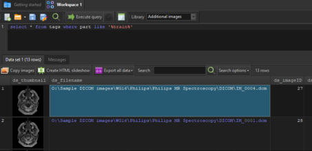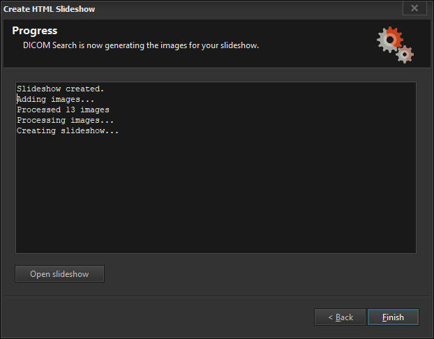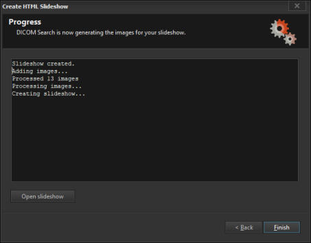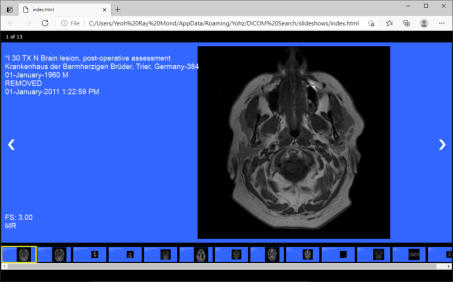In this exercise, we will use the images from our search results to create a HTML slideshow that looks like this:To start, click on the Create HTML slideshow button.Enter the HTML file name you want to use as the slideshow’s index page. There is currently only one slideshow template provided, so that is selected by default. You can easily modify that template to change the appearance of the HTML slideshow.You can then set the resize the image using the Image width and height settings.We will add a blue border around our image, with a wider area on the left.Click Next to continue to the next page. Here, you can embed an information profile into each image in the slideshow. We will choose an information profile that only displays values on the left.The margins determine the gap between the image border and the text for the information profile.Click Next, and DICOM Search will create our slideshow.Click on the Open slideshow button to view your slideshow.Next, let’s see how to export thumbnail images and the DICOM tag values from our search results.
