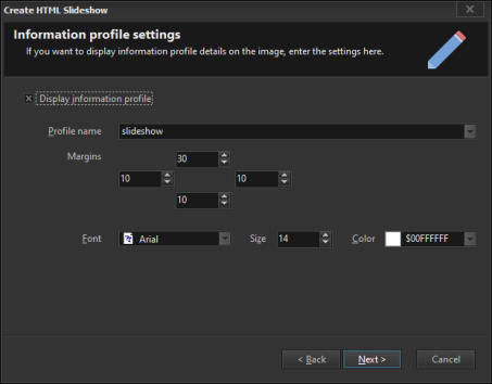 In this exercise, we will use the images from our search results to create a HTML slideshow that looks like this:To start, click on the Create HTML slideshow button.Enter the HTML file name you want to use as the slideshow’s index page. There is currently only one slideshow template provided, so that is selected by default. You can easily modify that template to change the appearance of the HTML slideshow.You can then set the resize the image using the Image widthand height settings.We will add a blue border around our image, with a wider area on the left.Click Next to continue to the next page. Here, you can embed an information profile into each image in the slideshow. We will choose an information profile that only displays values on the left.The margins determine the gap between the image border and the text for the information profile.Click Next, and DICOM Search will create our slideshow.Click on the Open slideshow button to view your slideshow.Next, let’s see how to export thumbnail images and the DICOM tag values from our search results.