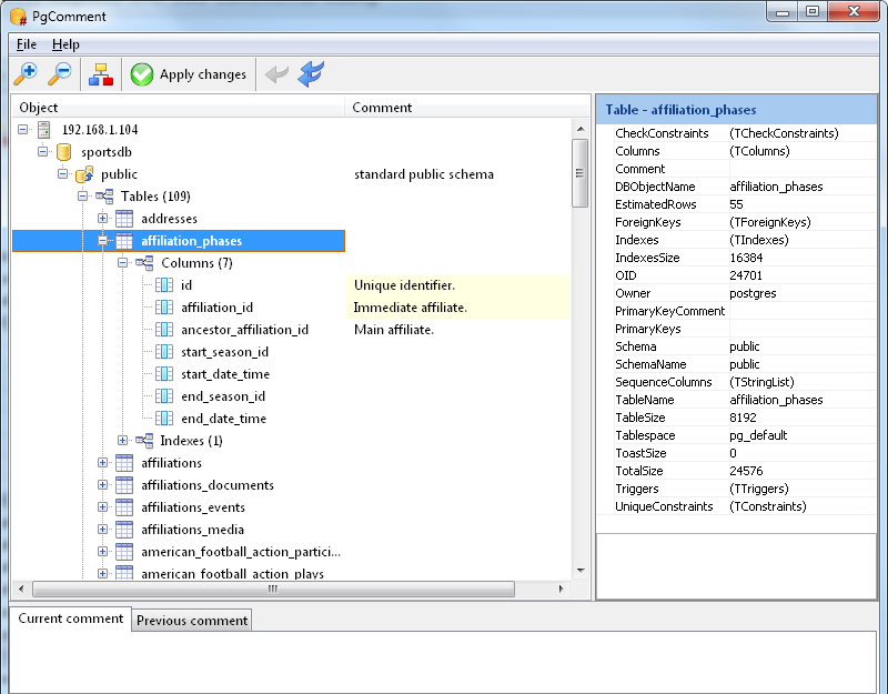 PostgreSQL schema, lists out the tables, columns, indexes,