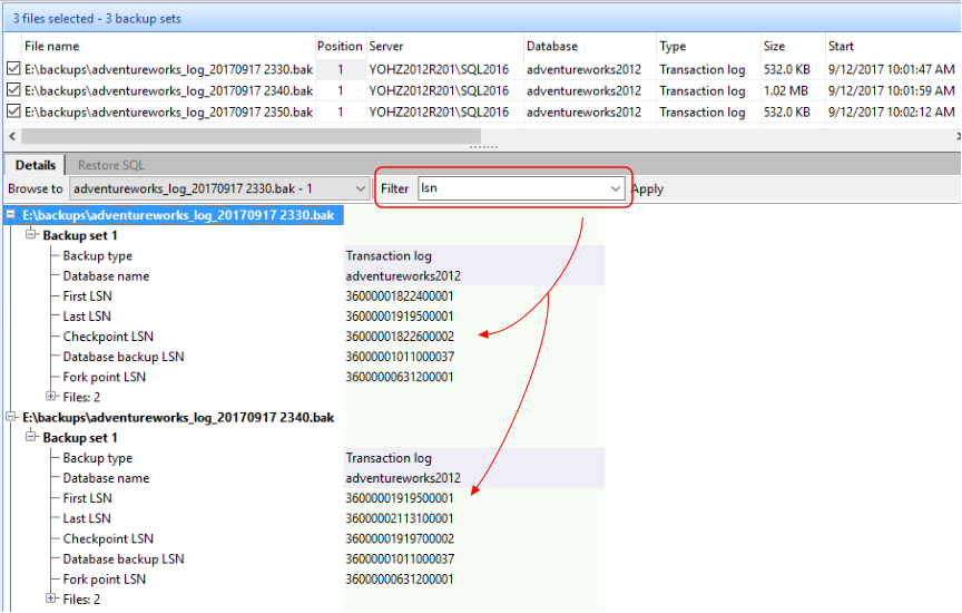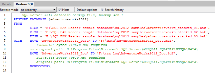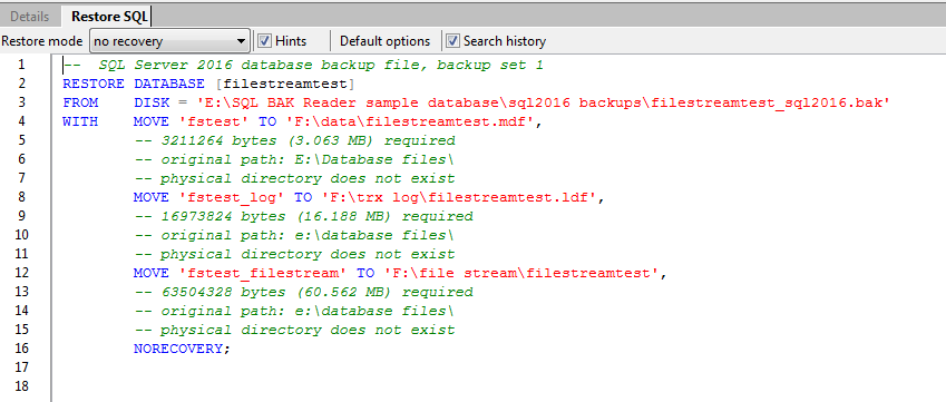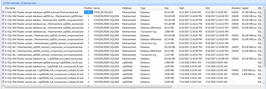 generated by SQL BAK Explorer. The file hints quickly tell you