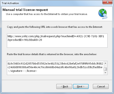 On the next page, an activation URL is provided to you. You can use this URL on another Internet-enabled device to retrieve your trial activation details.Use this URL on another Internet-enabled device to retrieve your trial activation details.Once you have obtained the trial license details, paste the details into the provided area. Click Next.The product will then inform you that the trial license has been successfully activated. If you encounter any problems, please drop us a line at support@yohz.com.